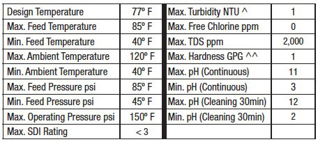 * Product flow and recovery rates are based on feed-water condition of 1,000 ppm of TDS @ 77F / 25C. Treatment ability of the RO System is dependent on feed water quality. Higher TDS and/or lower temperatures will reduce product flow. Performance projections should be run for each installation.